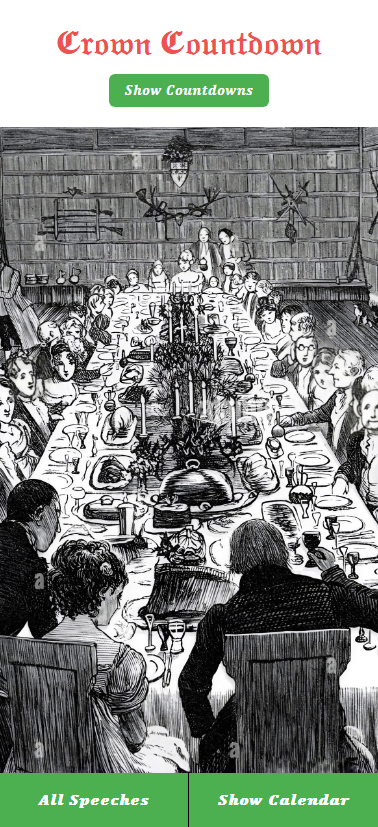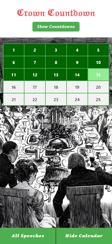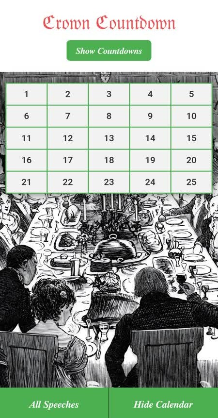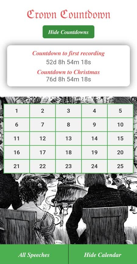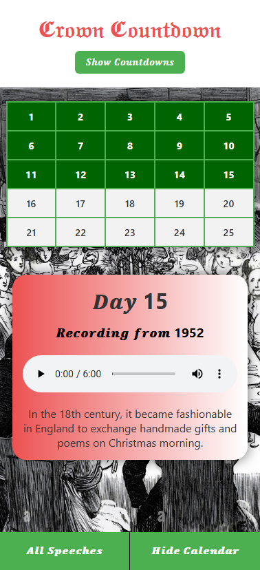 A Royal Christmas countdown app starting on the 1st of December. The Crown Countdown is a festive and historical advent calendar app that brings the magic of the Royal Christmas Broadcasts to your fingertips. Each day from December 1st to 25th, a new speech is unlocked — starting with speeches from the 1980s and journeying backward through time to the very first Royal Christmas message by King George V.
